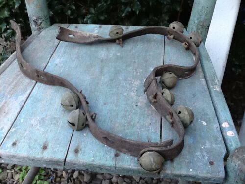 Title (ebay affiliate link): Early Primitive Brass Sleighbells on Old Leather Strap 9 Bells