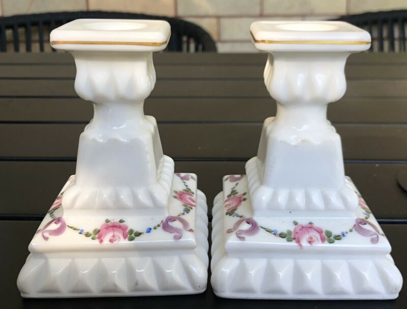 Title (ebay affiliate link): Vtg Pair (2) Westmoreland Milk Glass Hand Painted Candle Stick Holders Floral
