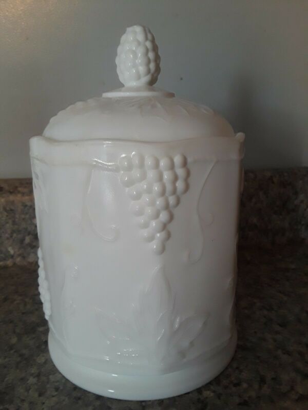 Title (ebay affiliate link): Vintage white milk glass paneled canister. Grapes and leaves pattern.