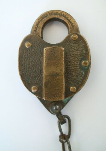 VINTAGE ANTIQUE BRASS J.H.W. CLIMAX CO.NEW JERSEY PAD LOCK W/CHAIN & NO KEY