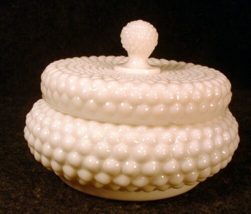 Title (ebay affiliate link): Vintage Irice White Milk Glass Hobnail Pattern Lidded Powder Jar / Trinket Box