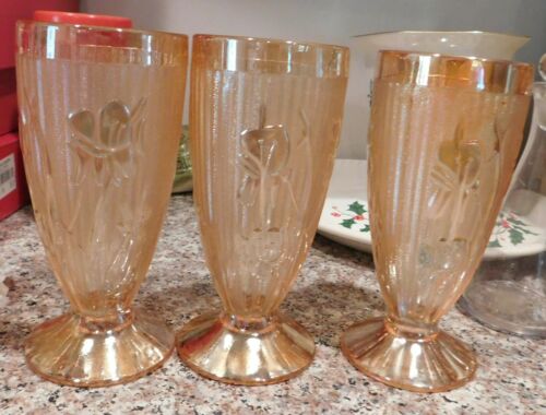 Title (ebay affiliate link): 3 Jeanette Glass Iris & Herringbone Carnival Marigold Footed 6" Footed Tumblers