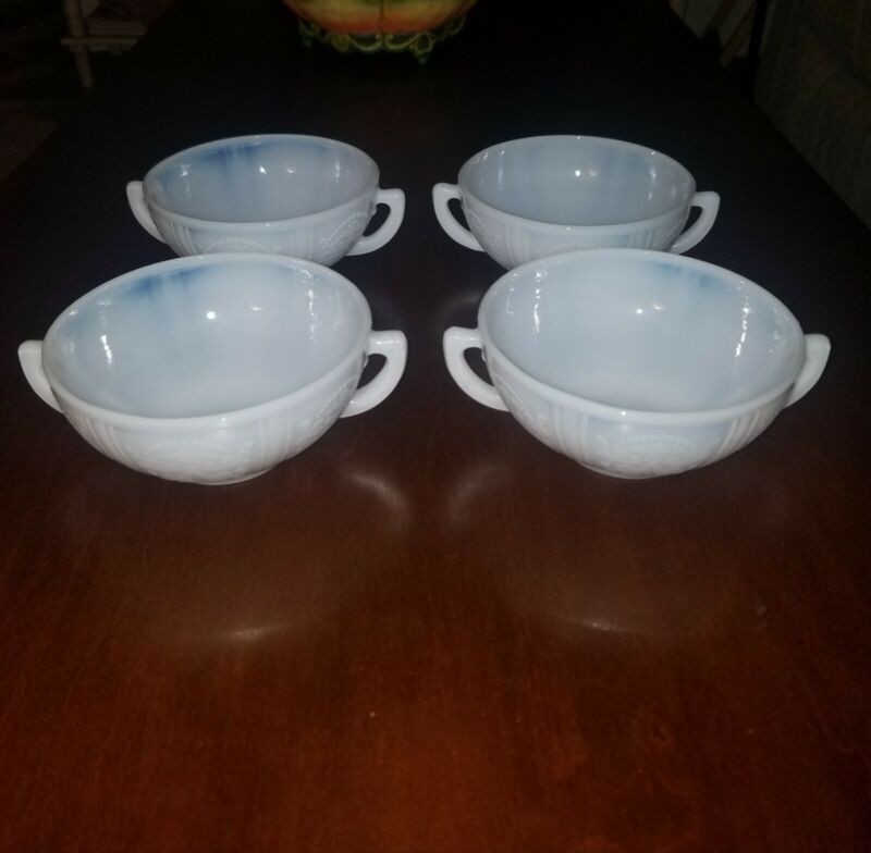 4 RARE Htf MacBeth Evans American Sweetheart White Opal Handled Cream Soup Bowls