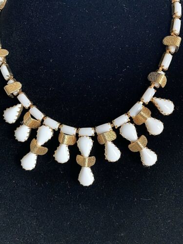 Vintage Weiss Milk Glass White Choker Necklace Gold Color Metal Gorgeous!