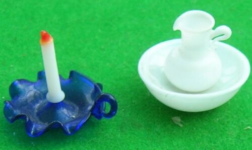 ANTIQUE GENUINE MILK GLASS JUG AND BOWL SET + BLUE CHAMBER STICK