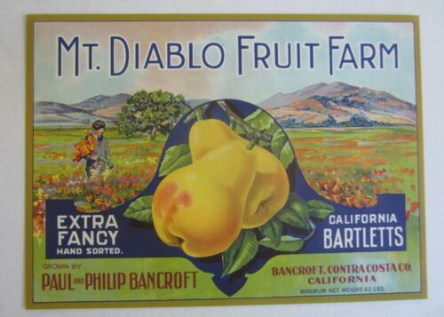 ORIGINAL Old Vintage - MT. DIABLO FRUIT FARM - Pear Crate LABEL - Bancroft CA.