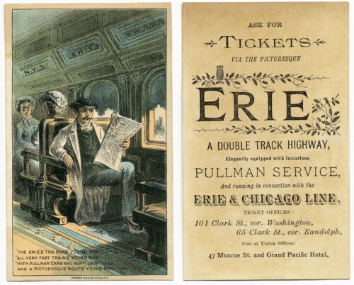 Title (ebay affiliate link): TRAIN TICKET Pullman Service ERIE CHICAGO LINE 1880 old Trade Card RAILROAD CAR