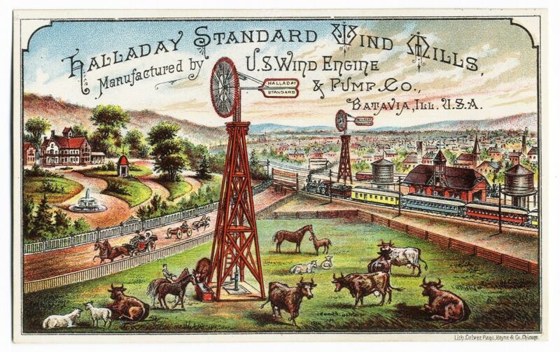 Title (ebay affiliate link): Batavia IL HALLADAY STANDARD WIND MILLS Farming Horses Cows VICTORIAN Trade Card
