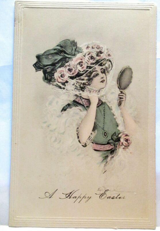 Title (ebay affiliate link): 1916 ARTIST SIGNED POSTCARD HAPPY EASTER, LADY LOOKING AT HAND WITH MIRROR