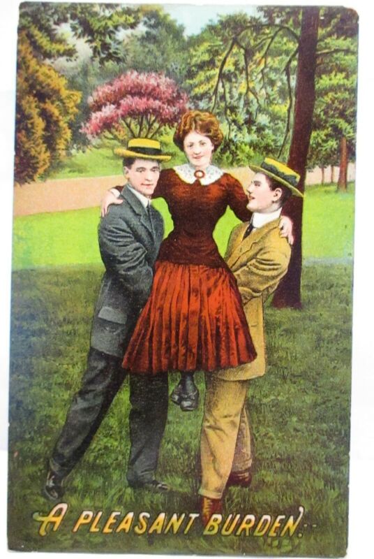 Title (ebay affiliate link): 1910 POSTCARD A PLEASANT BURDEN, 2 MEN HOLDING UP GIRL
