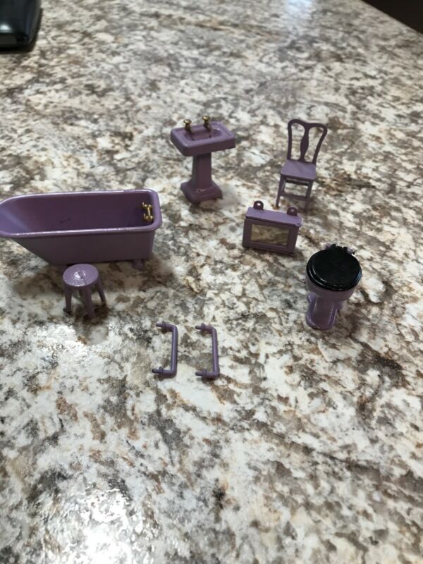 Title (ebay affiliate link): Vintage Tootsie Toy Doll House Furniture~Bathtub Toilet~Sink Chair Mirror Purple