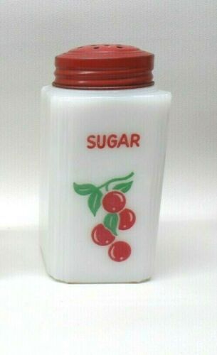 Title (ebay affiliate link): VTG TIPP WHITE MILK GLASS SUGAR SHAKER W/ CHERRIES DESIGN RED LID EC