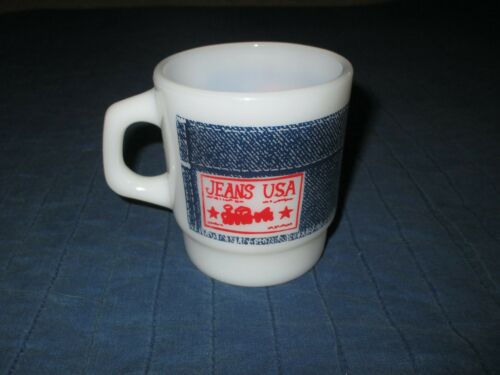 VINTAGE FIRE KING MILK GLASS ADVERTISING MUG CUP-DENIM-JEANS USA-RED BANDANA