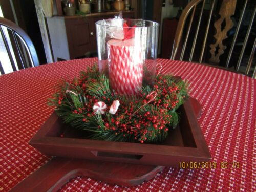 PRIMITIVE LARGE WOOD TRAY W/CANDY CANE CANDLE IN GLASS, GREENS & CANDY CANES