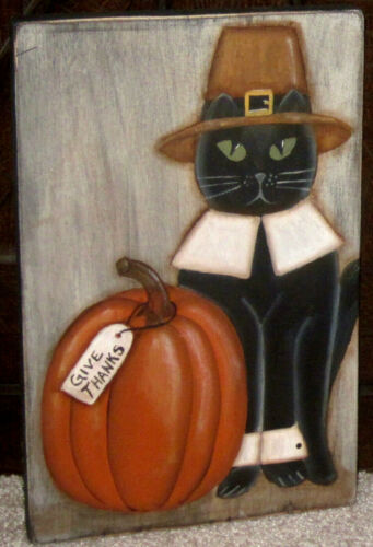 *~*PRIMITIVE*~* HP FOLK ART PRIM PILGRIM BLACK CAT *~* PUMPKIN *~* BOARD