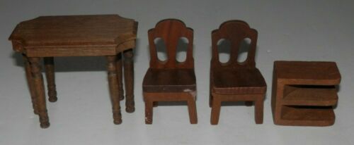 Vintage Strombecker 50s Wood Dollhouse Furniture 6 Leg Table 2 Chairs Side Shelf