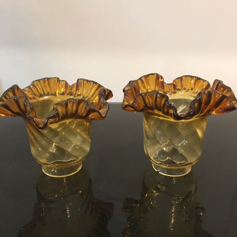 Title (ebay affiliate link): PAIR OF MINIATURE AMBER GLASS OIL LAMP SHADES