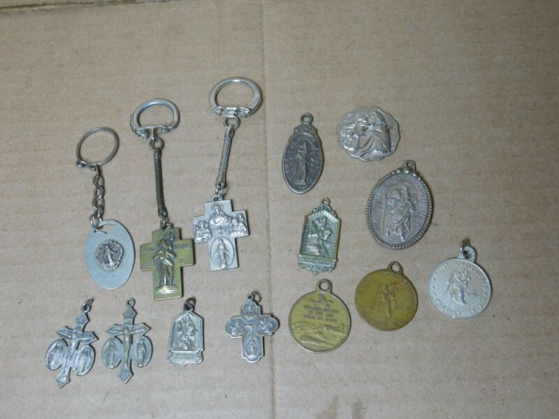 Mixed lot vintage Catholic Crucifixes key chains medals medallions
