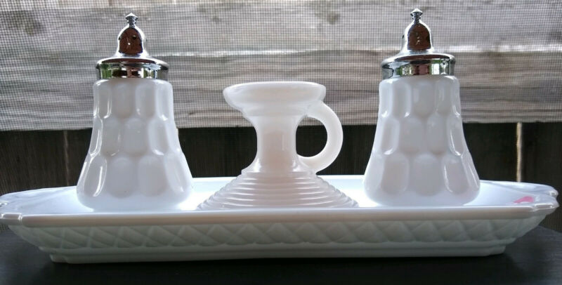 Title (ebay affiliate link): (4) White Milk Glass Salt Pepper Shaker, Condiment Tray, and Candlestick Holder