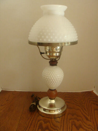 VTG GWTW HOBNAIL MILK GLASS & WOOD TABLE LAMP - EUC
