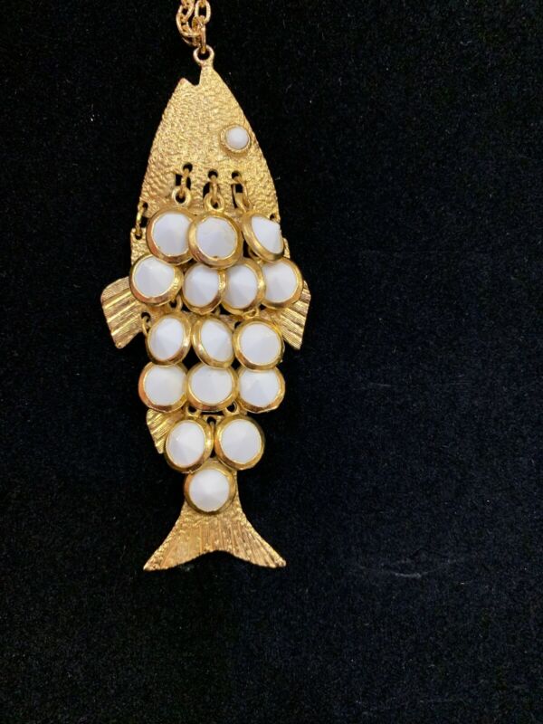 Title (ebay affiliate link): Lot-n Vintage Gold Tone Large Jointed Fish Pendant Necklace Rivoli Milk Glass