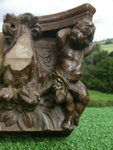 SUPERB 18thc RELIEF OAK CARVED BRACKET WITH NUDE CHERUB & FLOWER