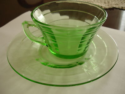 Title (ebay affiliate link): Green Depression Block Optic Hocking Cone Cup & Saucer