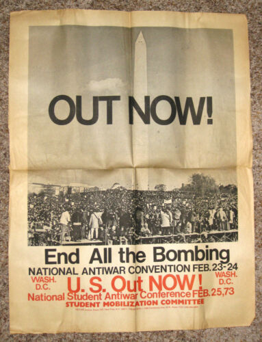 Title (ebay affiliate link): VINTAGE 1973 OUT NOW! END ALL THE BOMBING NATIONAL ANTIWAR VIETNAM BROADSIDE
