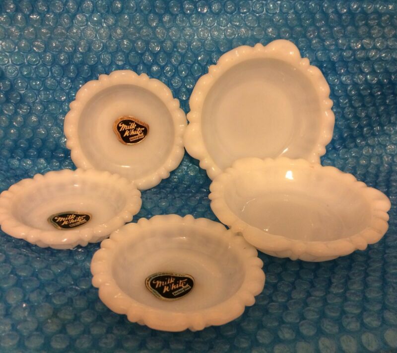 5 Anchor Hocking Milk Glass Dishes or Ashtray Factory Sticker