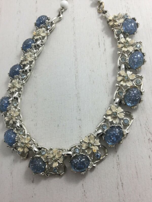 Title (ebay affiliate link): Vintage Silvertone Lucite Confetti Light Blue And Milk Glass Choker Necklace