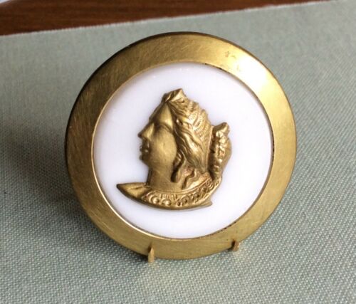 Title (ebay affiliate link): Pretty Classical Head On Milk Glass, Wide Brass Rim Metal Button