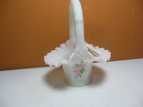 Vintage FENTON White Milk Glass Basket Pink Flowers D778 3523
