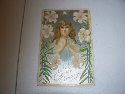 vintage antique postcard Easter Girl in prayer lilies silver gilt