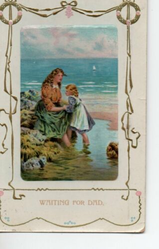 VINTAGE postcard: WAITING FOR DAD - LADY & GIRL ON THE SEASHORE 1916
