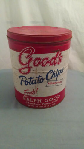 Title (ebay affiliate link): Vintage Large Ralph Goods Potato Chips White Red Tin Metal Can 2.4 lb