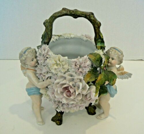 Title (ebay affiliate link): ANTIQUE DECORATIVE GERMAN PORCELAIN FLOWER ENCRUSTED CHERUB BASKET VASE