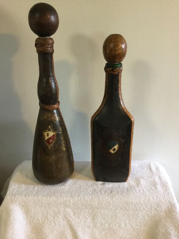 TWO Vintage Leather Covered Wine Bottles Made In Italy