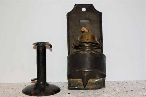 Title (ebay affiliate link): ANTIQUE TIN WALLMOUNT OIL LAMP - AND - TIN TOLEWARE CANDLESTICK W/ HOG SCRAPER