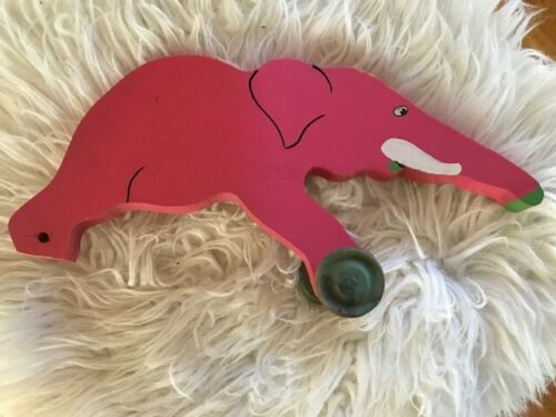 Vintage Wooden Children''s Toy Pink Elephant Pull Toy
