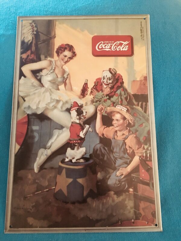 Title (ebay affiliate link): 1990 Coca Cola Metal Sign Ballerina Clown Dog & Little Boy 13x8.5" VERY NICE