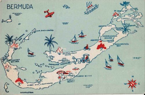 Antique Postcard Bermuda Map Icon Features Fort Bell U.S. Base Gibbs Lighthouse