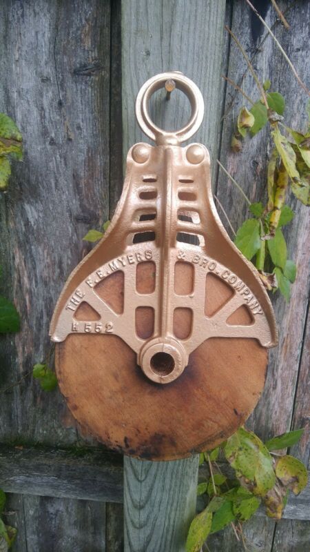 Title (ebay affiliate link): Antique Cast Iron Myers Rope Pulley Old Rustic Hay Barn Primitive Trolley Gold