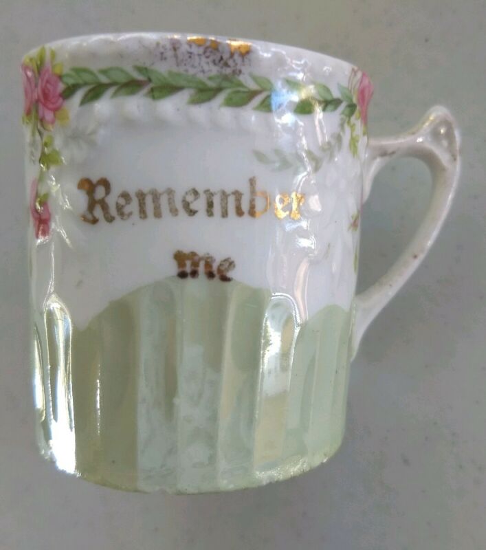 Antique "Remember Me" Cup Victorian Pearly White, Gold, Green, Pink Flowers, GUC
