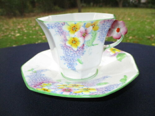 ART DECO CUP SAUCER LILAC TIME MELBA ENGLAND PINK ANEMONE FLOWER HANDLE