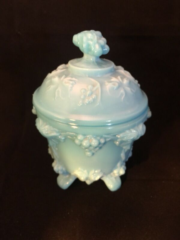 Vintage French Portieux Vallerysthal Blue Milk Glass Lidded candy Dish