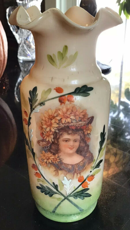 Early Victorian Enameled Ruffled Bristol Glass Portrait Vase