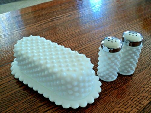 Title (ebay affiliate link): Fenton Hobnail Milk Glass Oval Butter Dish & Salt n Pepper W/Original Sticker