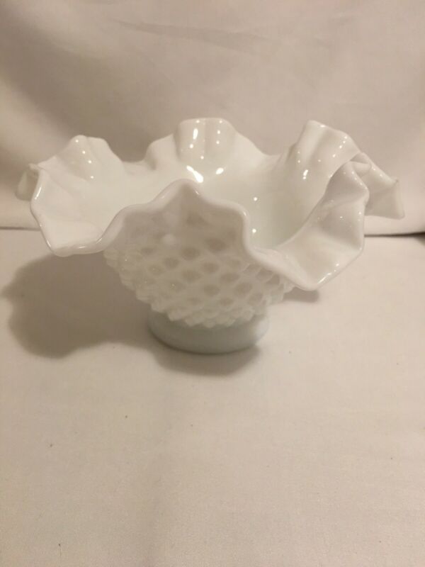 Title (ebay affiliate link): Fenton White Milk Glass Hobnail Ruffled Crimped Edges Candy Dish Fruit Bowl