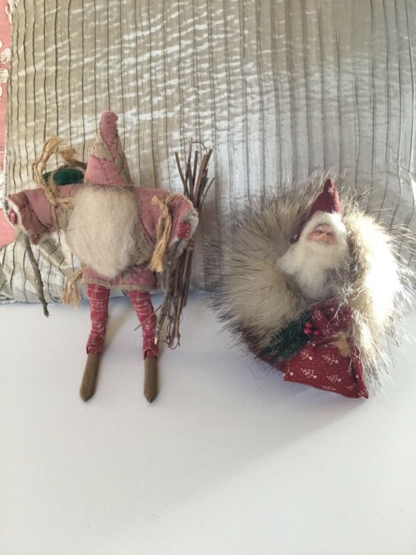 Title (ebay affiliate link): Vintage Look Prim Handmade Santas Lot of 2 one signed Quilt Skier and with Pack