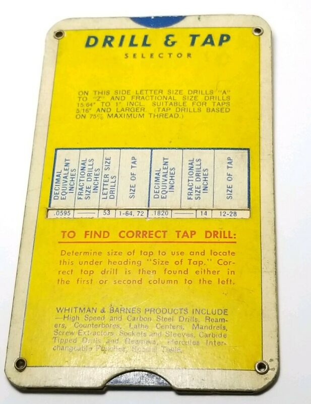 Vintage W&B Whiteman & Barnes Drill & Tap selector chart #lot919